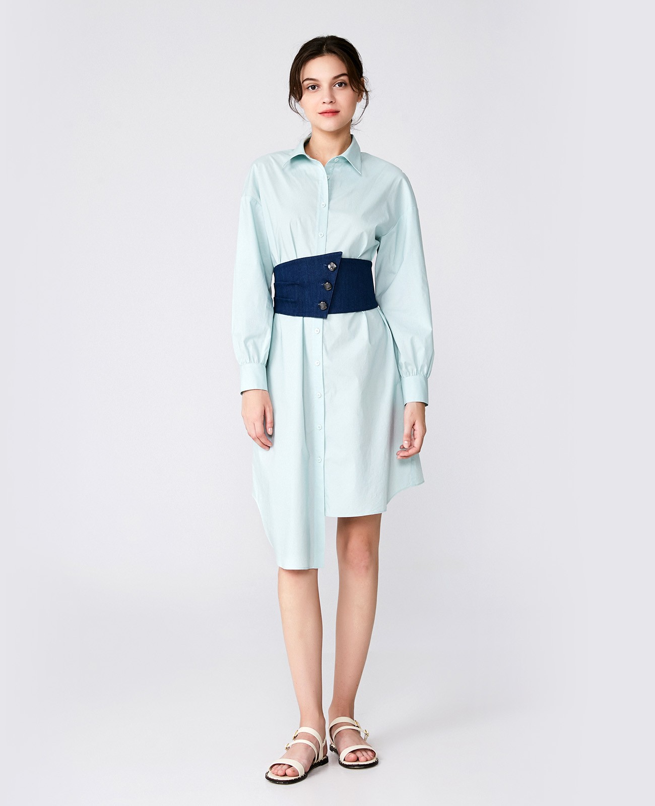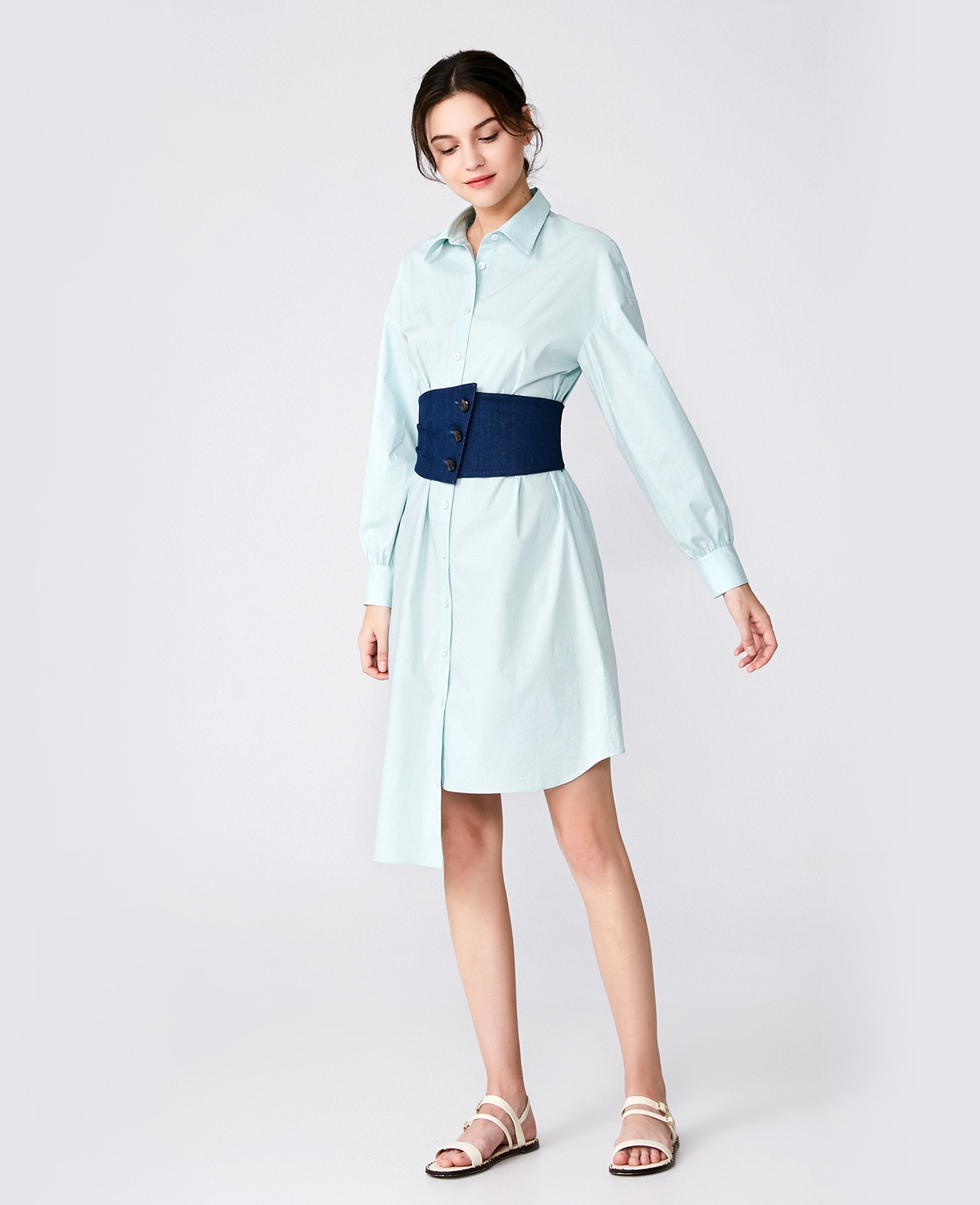 配腰带不规则下摆衬衫裙