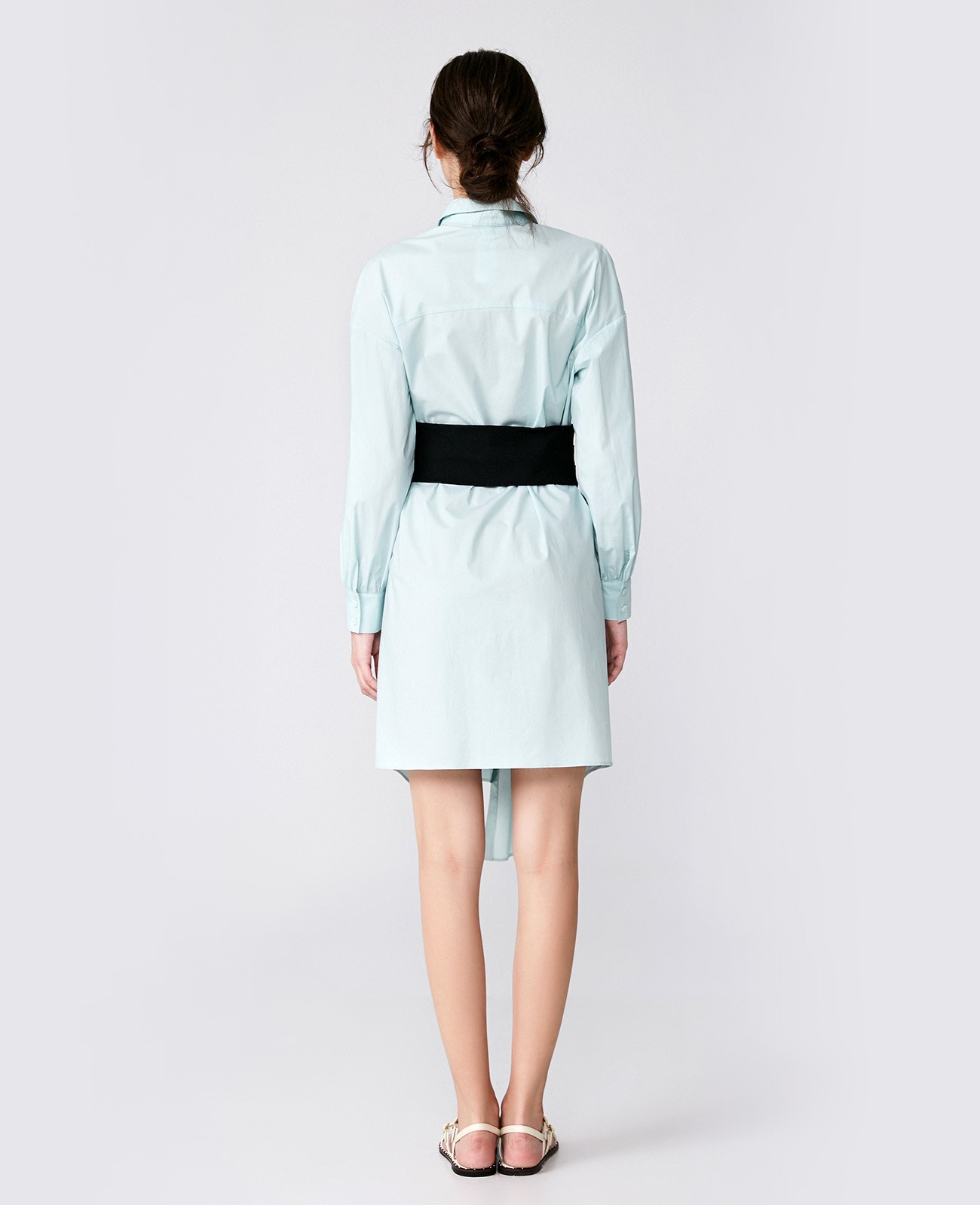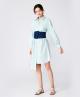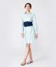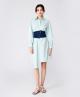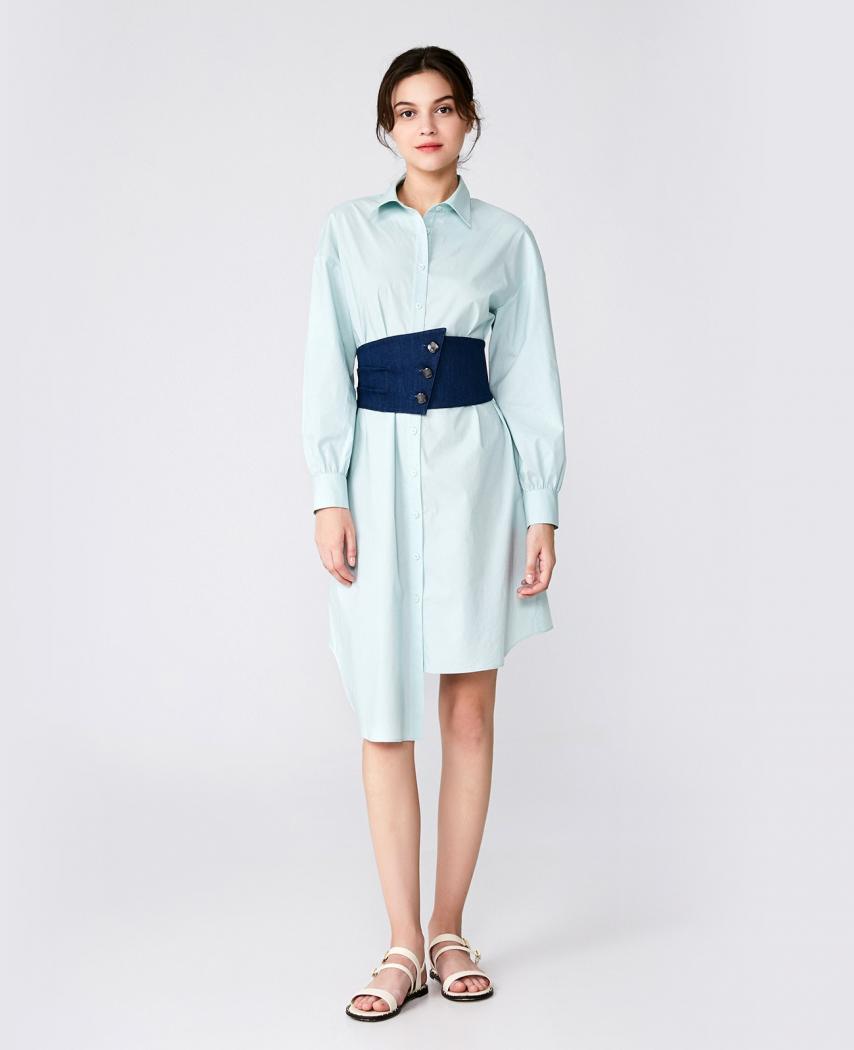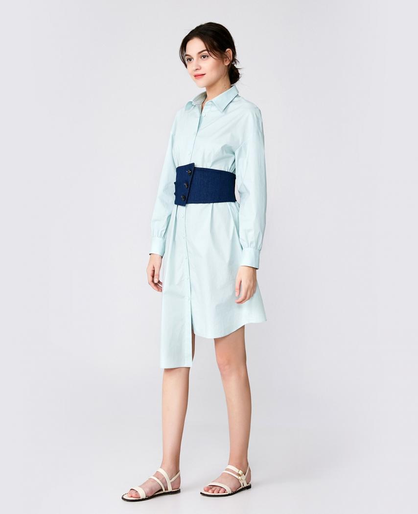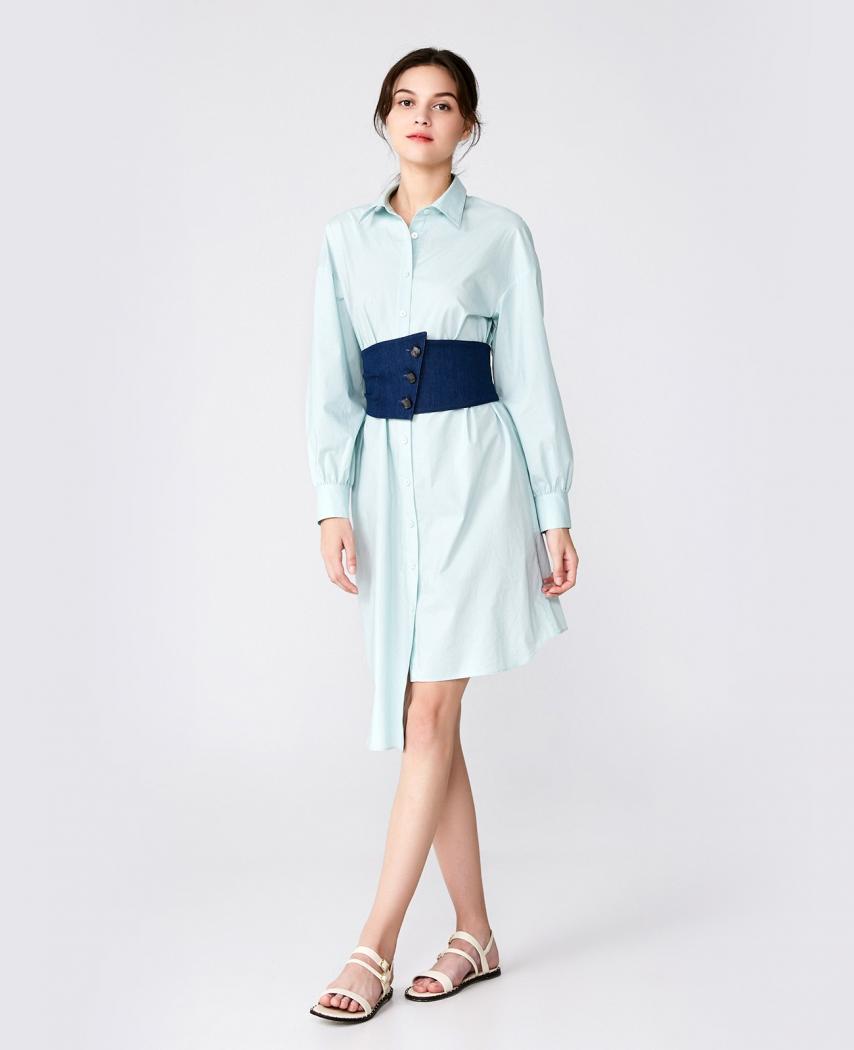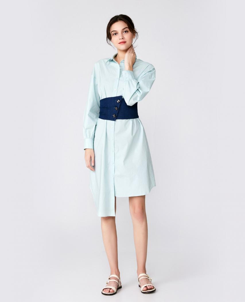 (下单后30天内发货) 薄荷绿衬衫式连衣裙,棉质的面料舒适透气,颜色清爽柔和,搭配牛仔的宽腰封,收腰显瘦,后腰封,采用针织面料,可根据腰的尺寸伸缩,舒适不紧绷。