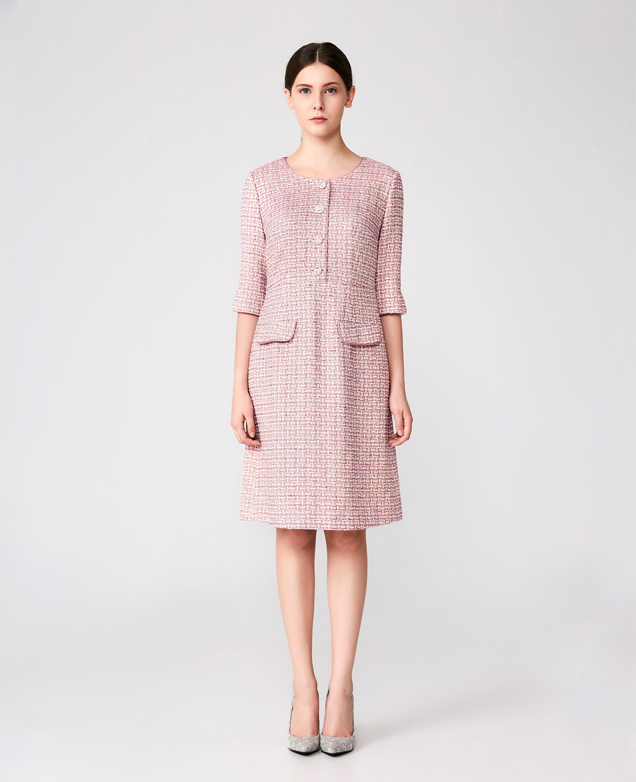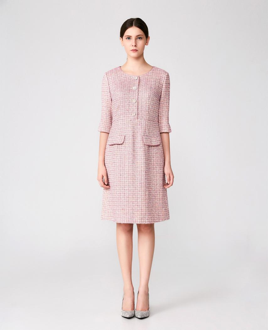 1、夹杂着彩色线的粉色粗花呢外套,仿佛披上一层层星星点点的光泽,浪漫而不失优雅,在职场中尤显温柔。 2、经纬线中加入了金银线丝,使得粉色粗花呢清新文雅;它的高级感增添了高贵优雅的女神气质。