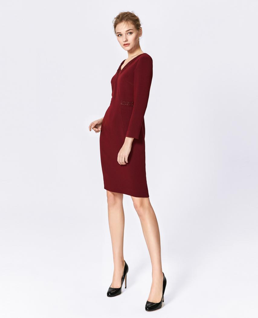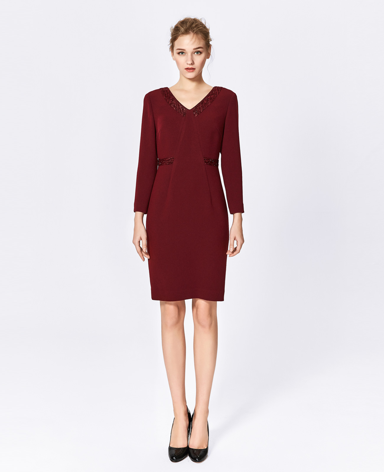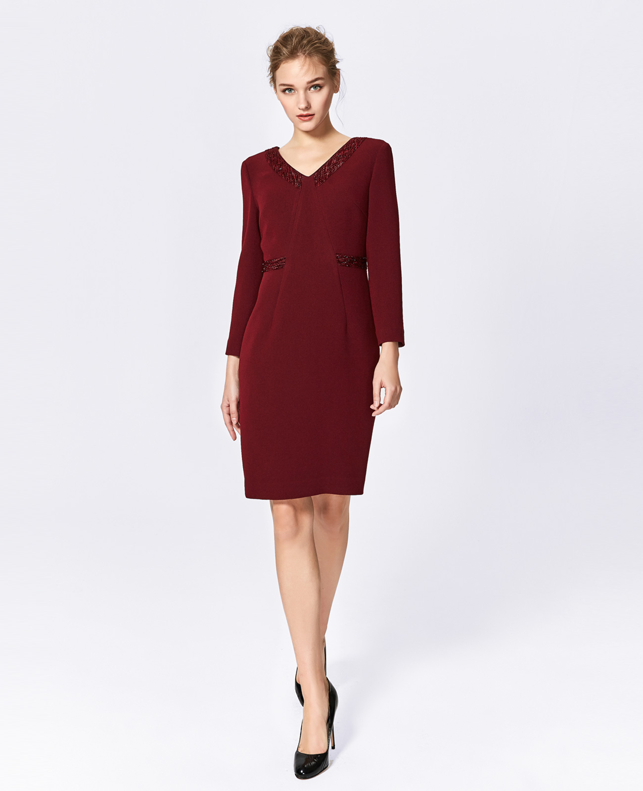 面料名称:酒红色V领裙 面料编号:FT-Fabric-0756